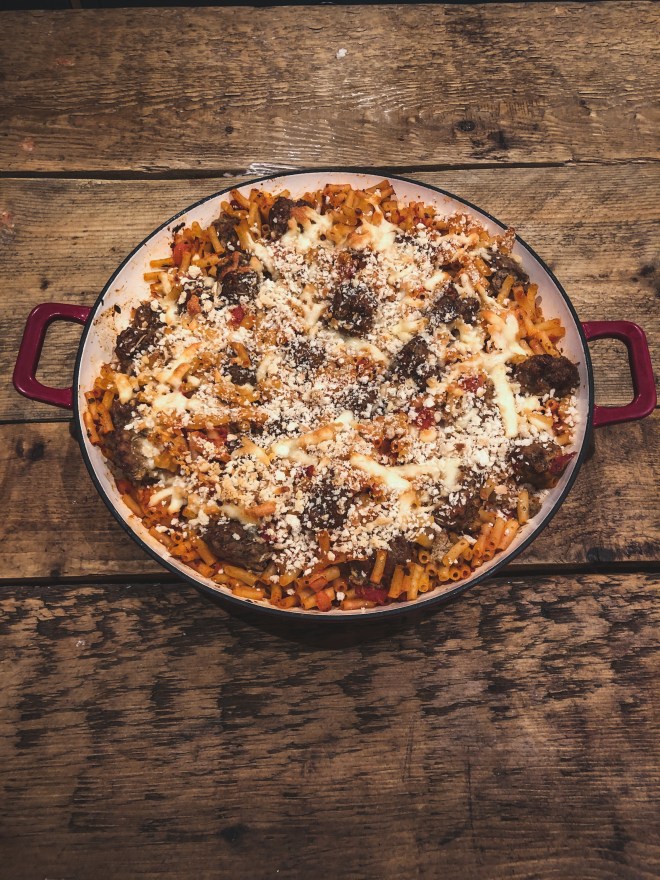 So… pork and beef meatballs baked in tomato and caramelized onion sauce and served with lashings of grated cheese.